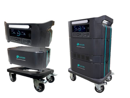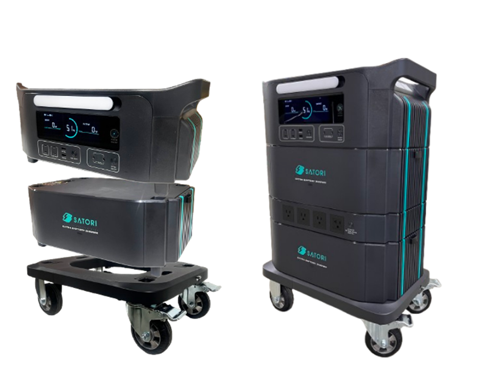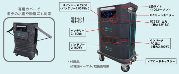 今回、レンタルを開始する「SATORICOREアクティオ専用仕様」は、この課題を解決するために開発された総容量5,357Whの当社独自仕様です。さまざまな環境下でも安心して利用できる大容量バッテリーは、現場での使いやすさを徹底的に追求しました。大型キャスターによるスムーズな移動を実現し、専用カバーを装着すれば多少の小雨や粉塵にも対応可能です。さらに、スマートフォンアプリにて残量を確認することが可能で、現場の作業効率を一層高めます。バッテリーはカセット式を採用し、ケーブルレスでの増設が可能で、必要な容量を必要なときに簡単に追加できます。
