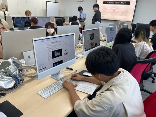 今回は、同校の「EC&ネットビジネス専攻」と「グラフィックデザイン&イラスト専攻」の学生を対象に、実践型のキャリア教育の一環として授業が行われました。