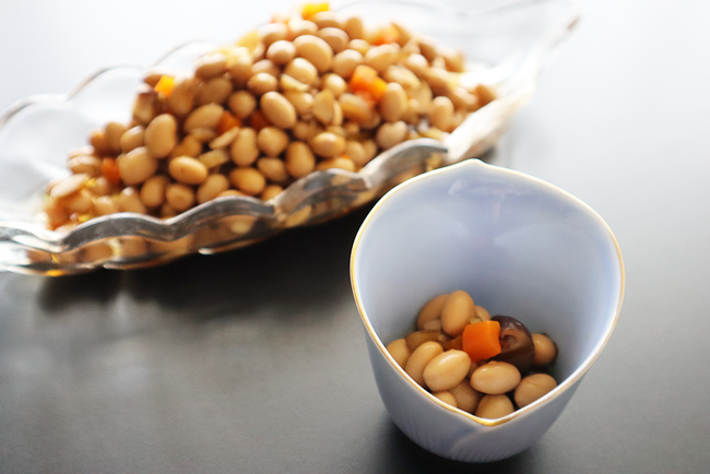 大豆・昆布・椎茸に加え、人参と牛蒡を精進出汁で煮たお料理です。