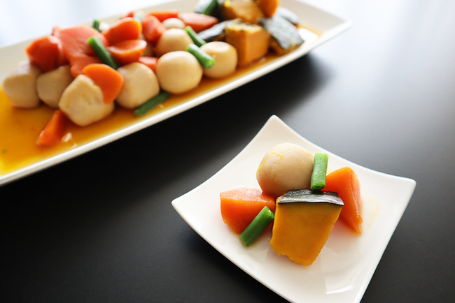 かぼちゃ、里芋、人参、インゲン豆を精進出汁で煮た、見た目にも鮮やかな煮物です。