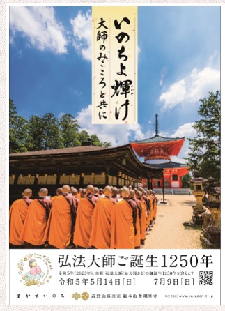 今年は、弘法大師空海(お大師さま)がお生まれになって1250年の記念の年です。高野山 金剛峯寺では、5月14日から7月9日まで「いのちよ輝け~大師のみこころと共に~」のスローガンのもと宗祖弘法大師御誕生1250年記念大法会(だいほうえ)が行われます。