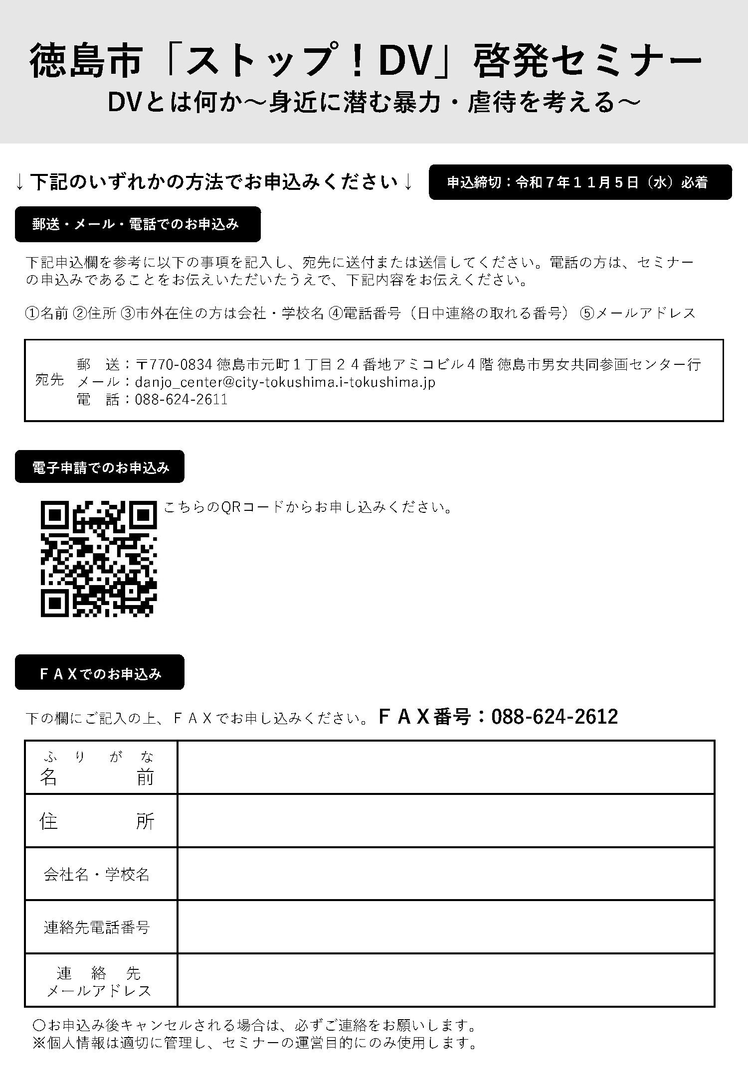 氏名、住所、市外住所の方は会社・学校名、日中連絡の取れる電話番号、メールアドレスを記載の上、郵送、ファックス、電話、メール、又は徳島市HP掲載の申込フォーム(外部サイト)のいずれかの方法でお申し込みください。