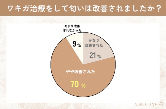 ワキガ治療をした効果の実感として「やや改善された」と答えた人が全体の7割でした。「かなり改善された」と含めると全体の9割を超える人が効果に満足していることが分かります。