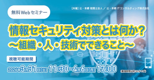 辻・本郷 税理士法人(本社:東京都新宿区、理事長:桑木小恵子)は、辻・本郷 ITコンサルティング株式会社(本社:東京都渋谷区、代表取締役社長:黒仁田健)と共催で、2026年3月31日(火)より「情報セキュリティ対策とは何か? ~組織・人・技術でできること~」セミナーを開催いたします。巧妙化するサイバー攻撃に対し、システムだけで情報を守るには限界があります。本セミナーでは、情報セキュリティの全体像を「組織・人・技術」の3つの視点から整理し、実効性のある対策をわかりやすく解説します。形骸化させない組織体制の構築や、罠を見抜く「判断力」の養い方、さらにクラウド環境に対応した最新の防御手法まで。各領域の具体的なポイントを紐解き、場所や環境を問わずに守りを固めるための実戦的なノウハウをお伝えいたします。