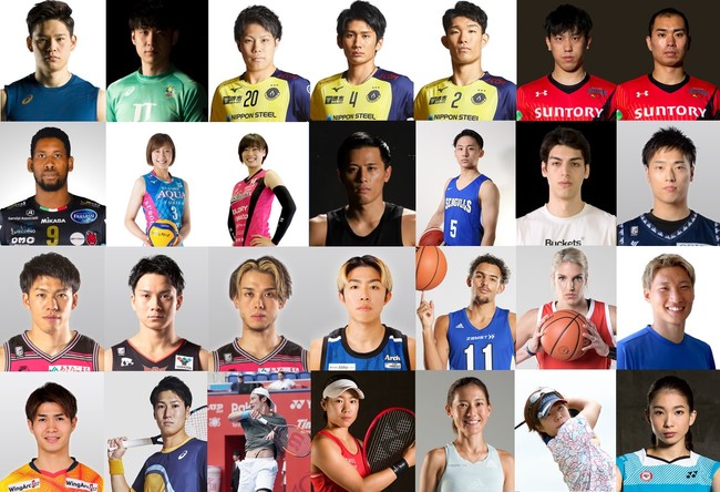 バレーボール:西田有志、小野寺太志、山本智大、高野直哉、樋口裕希、大宅真樹、鶴田大樹、ウィルフレド・レオン、間橋香織、佐々木千紘/バスケットボール:富樫勇樹、河村勇輝、シェーファー アヴィ 幸樹、岡田侑大、保岡龍斗、津屋一球、伊藤駿、寺嶋恭之介、トレイ・ヤング、エレーナ・デレ・ダン/サッカー:畠中槙之輔、佐藤亮/テニス:綿貫陽介、伊藤竜馬、日比野菜緒/マラソン:岩出玲亜/ゴルフ:穴井詩/バドミントン:松友美佐紀 他アスリート・チーム多数
