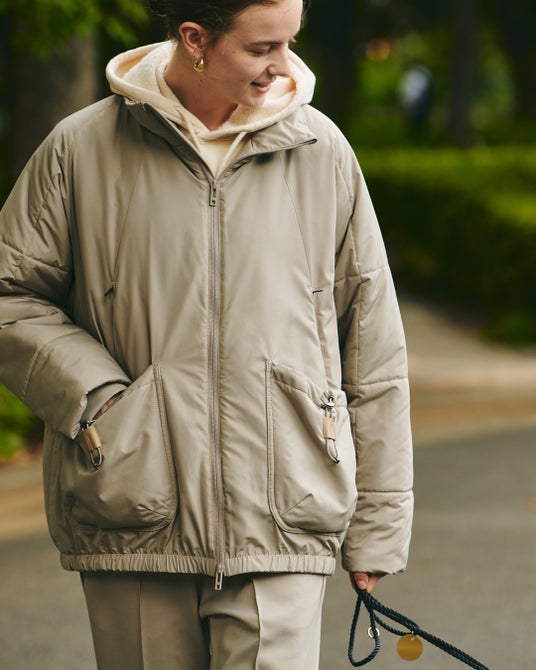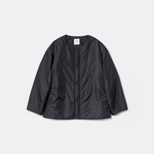 撥水加工を施した高密度タフタを使用した、ノーカラーの中綿ジャケット。裾に絞リが無いボックスシルエットで、サイド裾側のファスナーを開けるとテントラインに。身頃脇にたたきつけた同系色のロゴテープがアクセントになっています。