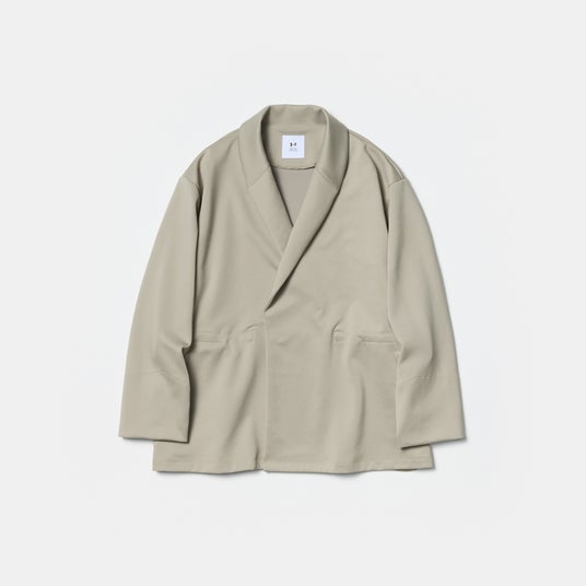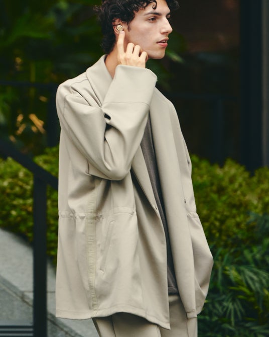 ショールカラーのガウンジャケット。ウエストにドローコード入りで、シルエットに変化をつけることが可能。脇から袖下にたたきつけた同系色のロゴテープがアクセントになっています。