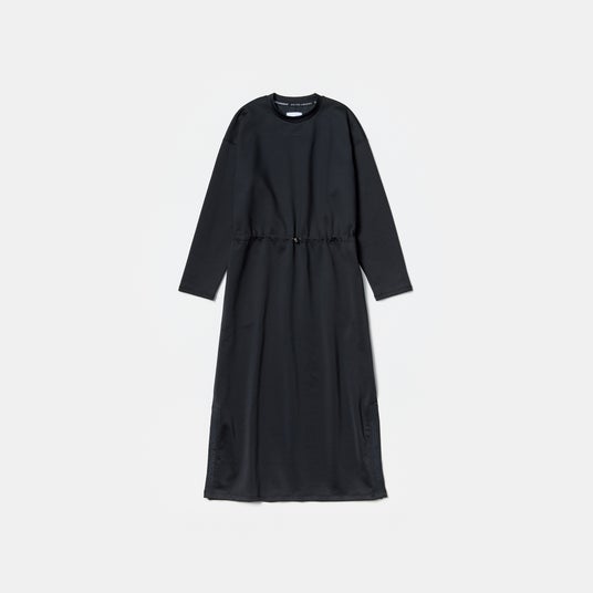 シンプルなロングワンピース。どのような動きにもスムーズに対応し、とても快適に着用していただけます。ウエスト部分はドローコード入りでシルエットの調節が可能。裾スリット部分にたたきつけた同系色のロゴテープがアクセントになっています。
