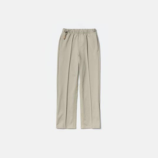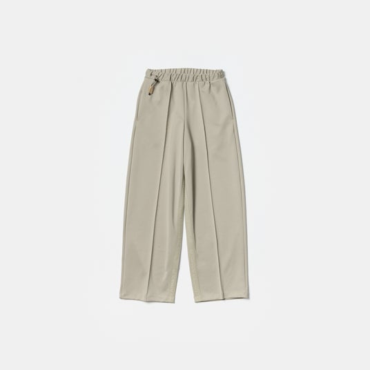 ワイドシルエットのパンツ。センターにクリースステッチ入りでスッキリ見え、インサイドシームにたたきつけた同系色のロゴテープがアクセントになっています。