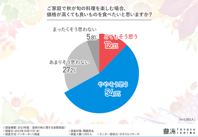 そこで、「ご家庭で秋が旬の料理を楽しむ場合、価格が高くても良いものを食べたいと思いますか?」と質問したところ、約7割の方が『とてもそう思う(12.3%)』『ややそう思う(54.7%)』と回答しました。