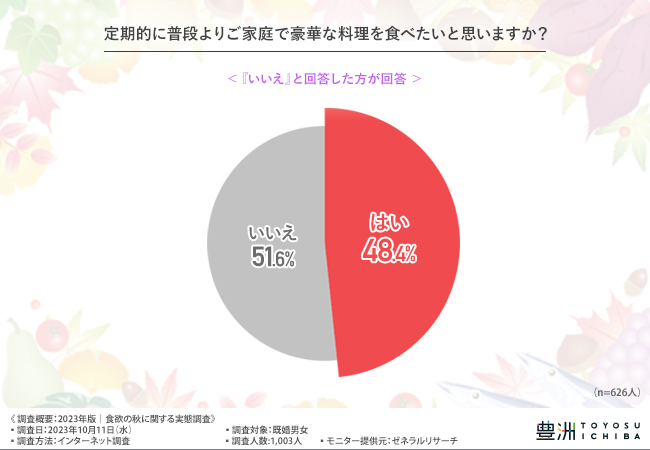 前の質問で『いいえ』と回答した方に、「定期的に普段よりご家庭で豪華な料理を食べたいと思いますか?」と質問したところ、『はい(48.4%)』『いいえ(51.6%)』という回答結果になり、たまには豪華な料理が食べたいと思う方も4割以上いることがわかりました。