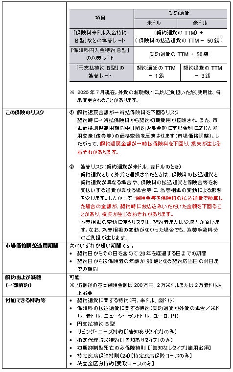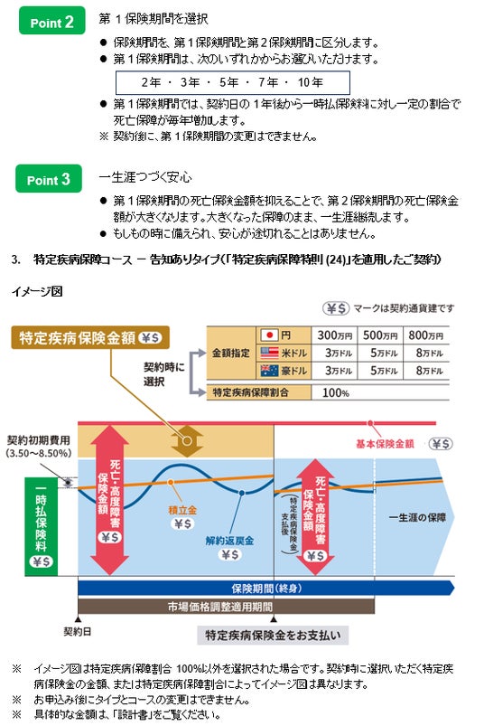 『未来につなげる終身保険v2』は、一生涯にわたって万一の保障を確保し、少しでも多くの資産を安心してご家族にのこしたいというお客さまのニーズにお応えする資産形成機能も備えた一時払終身保険です。円・米ドル・豪ドルから契約通貨をお選びいただき、お客さまのニーズにあわせて、死亡保障・高度障害保障*1のみの基本コース、ガン等の病気に備えられる特定疾病保障コース*2、必要な金額を特約積立金から引き出せる受取コースのいずれかをご選択*3いただけます。また、基本コースと受取りコースでは、契約後すぐに一時払保険料より大きな保障が確保できる「告知ありタイプ」と、契約初期の一定期間の保障を抑制し、その後の保障額を大きくすることで将来の手厚い死亡保障を確保できる「告知なしタイプ」をご用意しています。