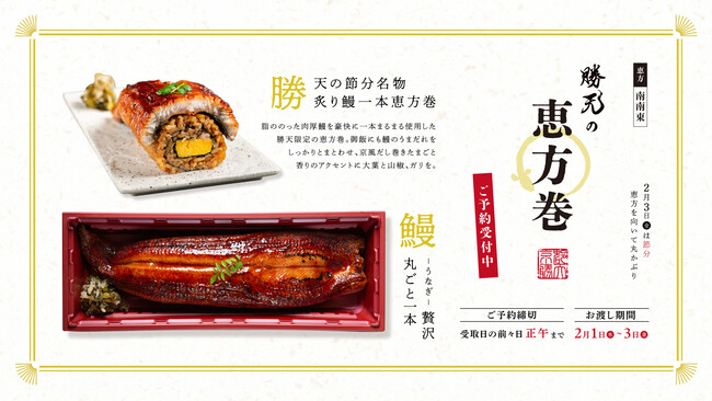 株式会社ゴリップ(本社:京都府京都市)が運営する酒と肉天ぷら「勝天-KYOTO GATTEN-」は2月3日(金)の節分に向けて「炙り鰻一本恵方巻」のご予約受付を開始いたしました。