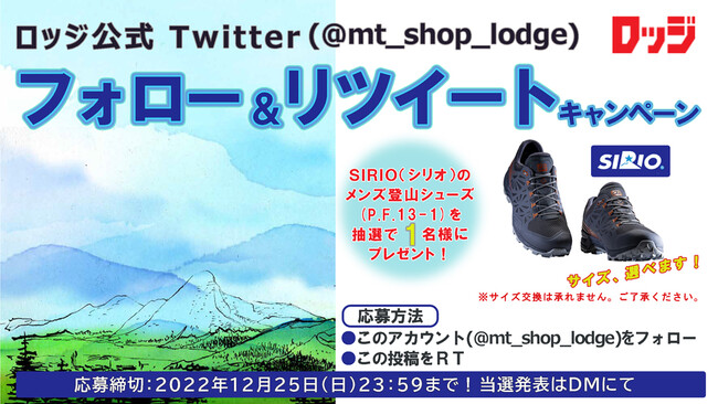 ゼット株式会社(本社/大阪市天王寺区、代表取締役社長/渡辺裕之)のグループ企業「山とアウトドア専門店ロッジ」は、ロッジ大阪店公式Twitterアカウントにて、SIRIO(シリオ)のメンズ登山シューズが抽選で当たるTwitterフォロー&リツイートキャンペーンを開催中です。