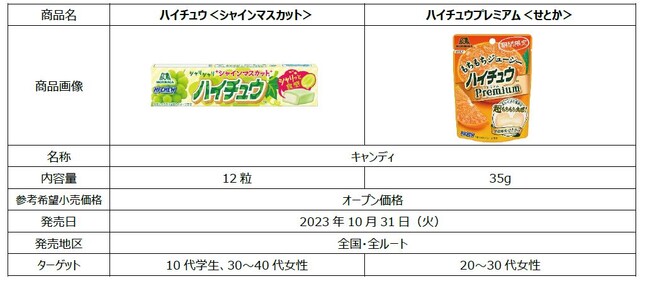 「ハイチュウ」は1975年の発売以来、心地よい食感とフルーツのジューシーな味わいで、長きにわたり多くのお客様にご愛顧いただいております。今回の「ハイチュウ<シャインマスカット>」は、昨年発売しご好評いただいた”シャインマスカット味“をリニューアルし、さらにおいしく仕立てました。シャリっとした食感と、みずみずしいシャインマスカットの味わいを楽しめます。「ハイチュウプレミアム<せとか>」は、みかんの大トロとも呼ばれる高級ブランドの「せとか」を使用することで、贅沢な果汁感を感じられる、プレミアム品質のハイチュウにぴったりな味わいに仕上げました。濃厚でジューシーなフルーツの味わいを楽しめる商品の発売により、お客様に笑顔をお届けしてまいります。