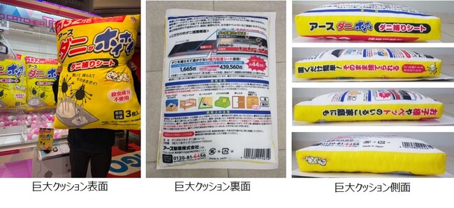 『ダニがホイホイ ダニ捕りシート 超超超巨大クッション』は、クレーンゲーム機の獲得口を通すことも困難なほどの巨大クッション(約90cm×66cm)です。詰まりに詰まりすぎた、たくさんの愛によりふっかふかで、リビングなどに置くだけ簡単、極上のリラクゼーション効果と圧倒的な優越感をお楽しみいただけます。お客様が手放さない限り永遠にご使用いただけ、お子様のいるご家庭にもおすすめです。見事獲得した場合には、あなたも1/37万匹※のダニの気持ちになれること間違いなしです。全国のアミューズメント施設に駆けつける前に「#ダニがホイホイ超超超巨大クッション」でつぶやいてみてください。この様子はアース製薬公式Twitter(https://twitter.com/EarthOfficialJP)で情報を発信します。