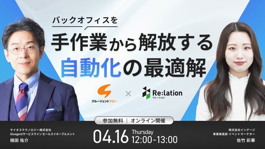 コミュニケーションプラットフォ-ム「Re:lation(リレーション)」を提供し、6,000社以上(※1)の導入実績を誇る株式会社インゲージ(本社:大阪府大阪市、代表取締役社長:和田 哲也、以下インゲージ)は、2026年4月16日(木)、サイオステクノロジー株式会社と共同で、バックオフィス業務の自動化をテーマにした無料ウェビナー「バックオフィスを『手作業から解放』する自動化の最適解」を開催することをお知らせいたします。
