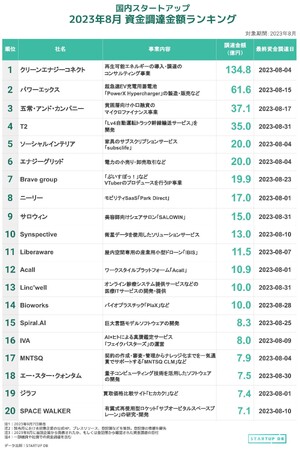 成長産業支援事業を推進するフォースタートアップス株式会社(本社:東京都港区、代表取締役社長:志水雄一郎 以下、フォースタートアップス)は、継続的に国内スタートアップ動向に関する調査を行い、当社サービスである「STARTUP DB(スタートアップデータベース)」に調査結果を公開しています。今回は、2023年8月に発表された「国内スタートアップ資金調達金額ランキング(2023年8月)」を発表いたします。