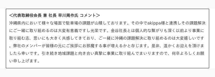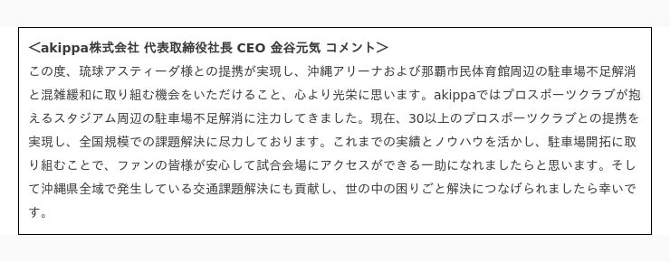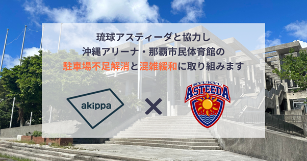 琉球アスティーダスポーツクラブ株式会社(所在地:沖縄県中頭郡中城村、代表取締役会長:早川周作)は、駐車場予約アプリ「akippa」を運営するakippa株式会社(代表取締役社長 CEO:金谷元気) と提携し「沖縄アリーナ」および「那覇市民体育館」周辺の駐車場開拓を開始いたしましたので発表いたします。
