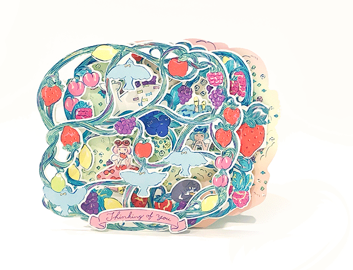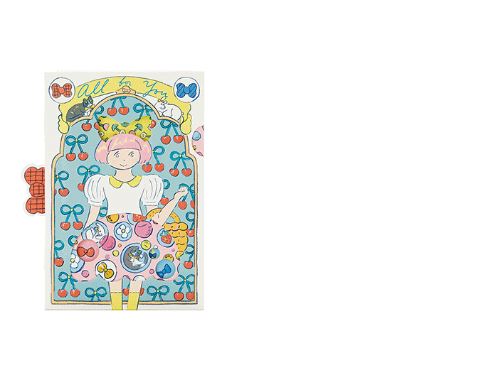 今回のシリーズの「ふたりぼんちゃん」は、幼いころから触れてきたことで自分の頭の中にある、サンリオのイメージをテーマに描きました。今回一緒に作らせて頂いて、改めて仕掛けカードの楽しさを再認識しました。手で触れて、自分で何かを変化させられるのってやっぱりワクワクします。カードならではのメッセージ欄もありますので、大切なだれかとぜひワクワク感を共有して楽しんでいただければ嬉しいです。