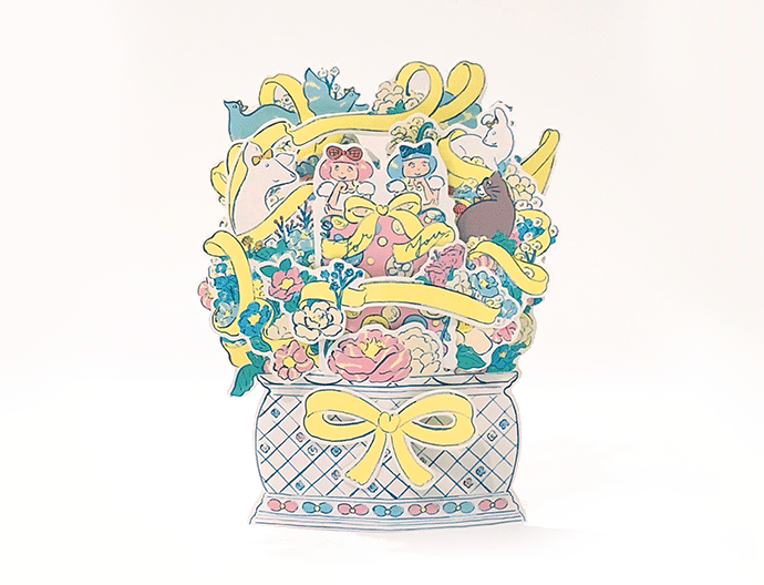 お花とリボン、動物たちのイラストが印象的な花瓶形で、立てて飾れます。真ん中にいるふたりぼんちゃんは、取り外し可能な2つ折りの小さなミニカードになっています。