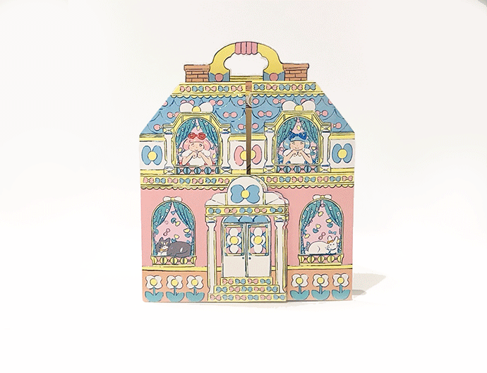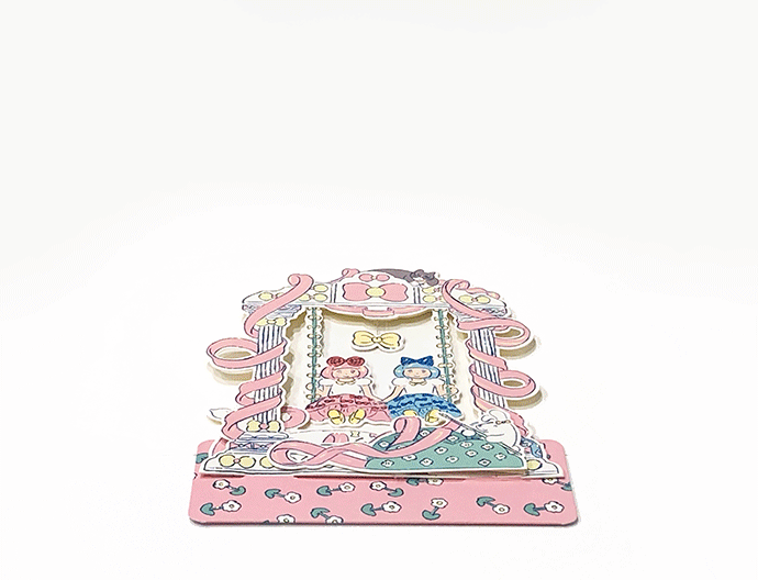 扉を開くと、2階建てのドールハウス型になり、立てて飾れます。リボンで猫と遊んだり、リボン型の本を読んだり、リボン付きの2段ベッドで眠ったりと、ふたりぼんちゃんの一日を再現しました。背面にメッセージスペースがあります。