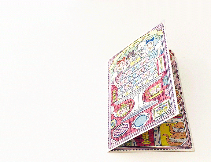 緻密でありつつ軽やかな描画、透明感のあるカラフルな色彩の世界に、キラキラとしたホログラム箔を施したカードは、立てて飾ることや、それぞれ違う仕掛けをお楽しみいただけます。