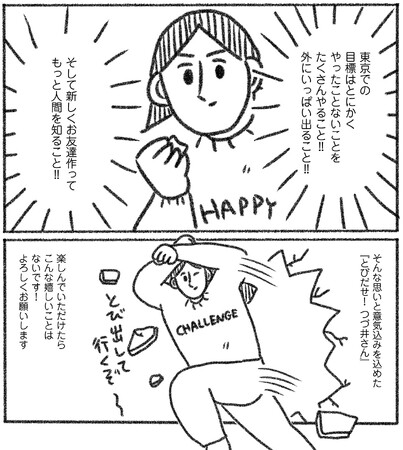 連載第1回で描かれるのは、実家を出るにあたり断捨離に励むつづ井さんが見つけた「どうしても捨てられないもの」。「東京ではとにかくやったことのないことを沢山やる。外にいっぱい出る!!︎」というつづ井さんの新発見てんこもりの東京ライフが、スタートします!!