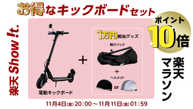 楽天市場「Show !t」は11月4日(金)20時開始、MESTER.F電動キックボードご購入で、10,000円相当のヘルメット・輪行バックセットをプレゼントするキャンペーンを開催。電動キックボードで爽快な秋のお出かけを楽しもう。また、11月4日(金)20時~11月11日(金)01時59分まで開催されるポイント最大44倍楽天お買い物マラソンに参加し、全商品送料無料でポイント10倍プレゼント(一部商品を除く)を実施します。
