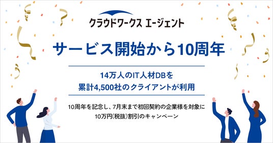 フリーランス業界最大級プラットフォーム(登録ワーカー700万人・登録企業100万社)を基盤に、IT人材&DXコンサルティングサービスを提供する株式会社クラウドワークス(本社:東京都渋谷区 代表取締役社長 兼 CEO:吉田 浩一郎 以下「当社」)は、運営する総合人材ソリューションパートナー「クラウドワークス エージェント」が2015年のサービス開始から10周年を迎えたことをお知らせします。