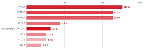 プロミスの審査結果が通知されるまでの時間は、「30分以内」が最も多く25.3%、続いて「1時間以内」と「3時間以内」が同率で22.8%となった。