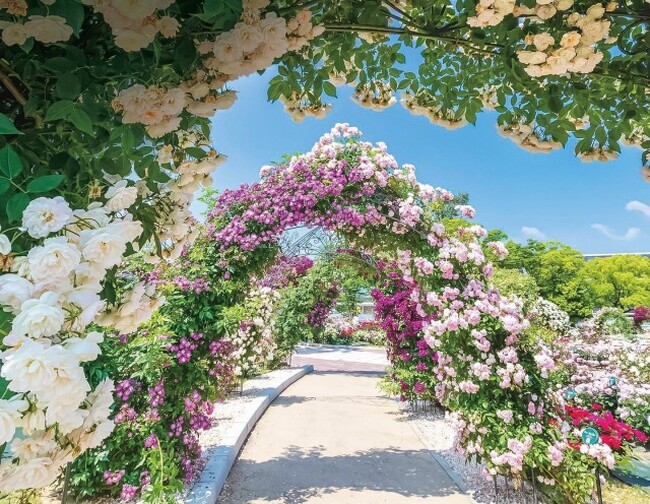 1970年の大阪万博開催時、世界9ヵ国から平和を願って贈られたバラたちと、最新のバラを取り入れ「平和のバラ園」。4年前に大規模リニューアルしたバラ園のバラは、年々ボリュームアップし、約250品種・約2,400株の優美なバラの姿はもちろん、豊かな香りもぜひお楽しみください。