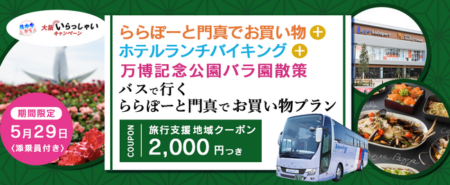 《大阪いらっしゃいキャンペーン》5月29日(月) 三井ショッピングパーク ららぽーと門真・三井アウトレットパーク大阪門真+守口のホテルでバイキングランチ+万博記念公園 バラ園を散策 バスで行く『薔薇も買い物も今が旬!ららぽーと門真に行こう』
