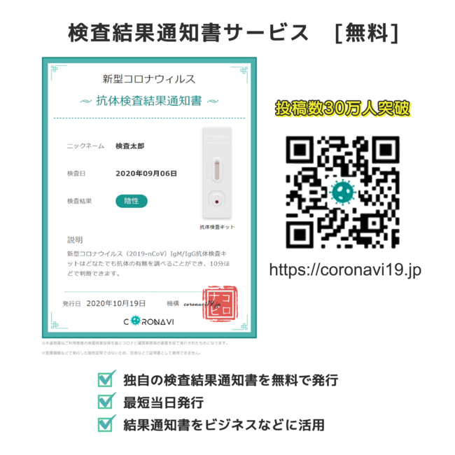 当社が提携している[CORONAVI]サイト利用者数がリリースかわずか3か月で利用者数30万人を突破しました。CORONAVIでは独自の検査結果通知書を最短当日中に無料で発行しております。