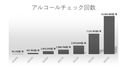 開始当初は月間1万人未満でしたが、6年目を終え、現時点で月間約80万人がクラウドアルコール検査を利用しています。2024年既存契約緑ナンバー事業者の飲酒検査分に加え、白ナンバー義務化開始から1年分が加算され、年間で1300万回以上の飲酒検査が行われた年となりました。