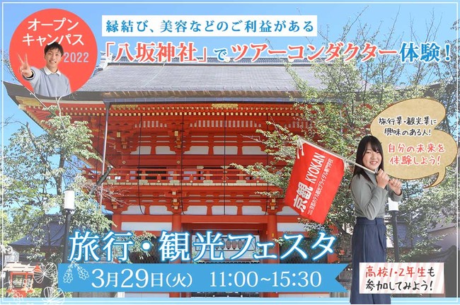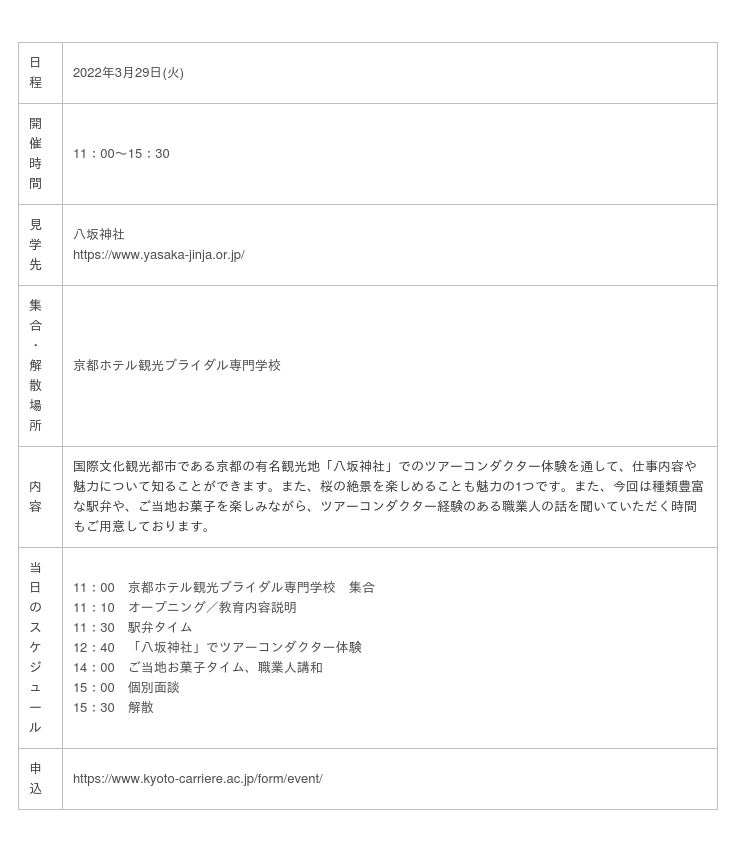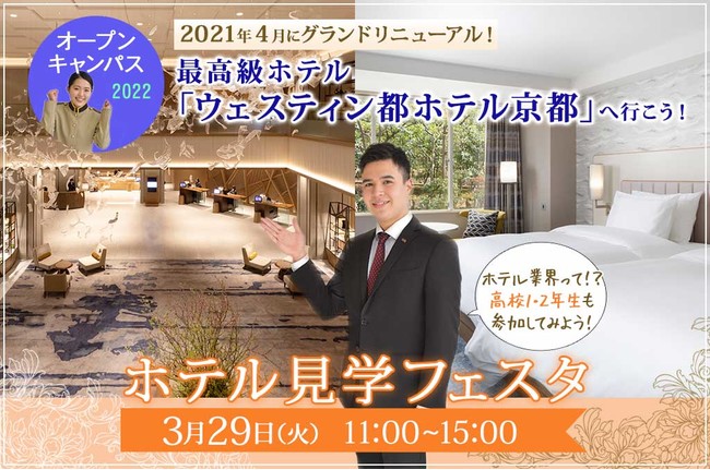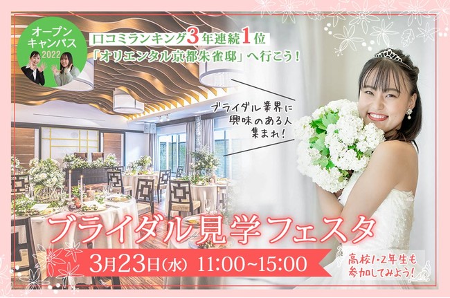 京都ホテル観光ブライダル専門学校は2022年3月に業界見学フェスタを開催いたします。高校生の進路活動の一環として現場を見て業界を知る機会を提供することを目的としたオープンキャンパスで、23日(水)に「ブライダル見学フェスタ」、29日(火)に「旅行・観光フェスタ」、「ホテル見学フェスタ」を予定しています。それぞれ京都の歴史ある結婚式場・観光地・ホテルである「ORIENTAL KYOTO SUZAKU-TEI 朱雀邸」、「八坂神社」、「ウェスティン都ホテル京都」での館内見学やランチなどが体験可能です。
