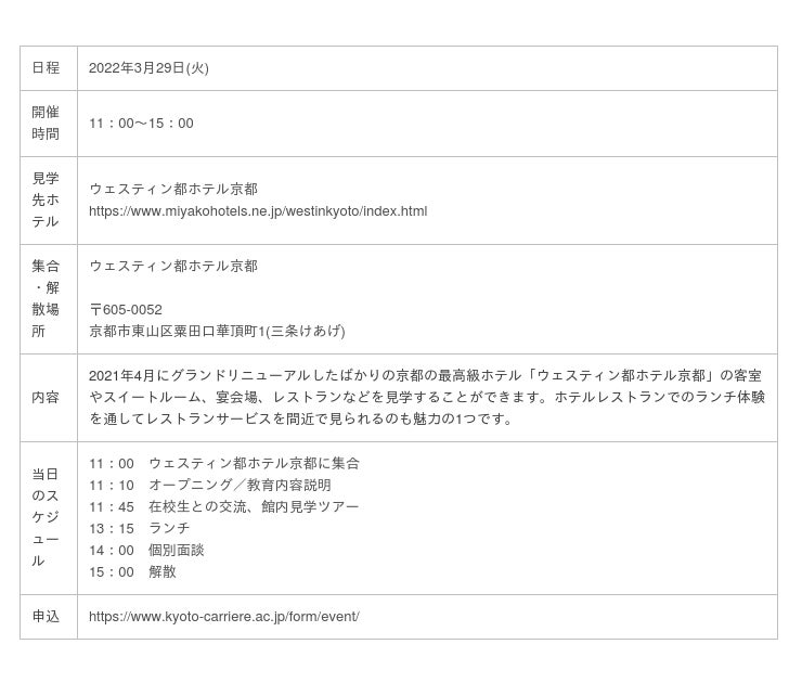 本イベントでは、普段見学することが難しい一流ホテルや国際文化観光都市である京都の観光地で、ホテル・観光に関わる職業理解を深めることができます。実際の現場を訪れて施設を見学したり働くスタッフの様子を観察したりすることで、自分の働く姿をイメージし、自己の進路選択活動や進路実現に向けての足掛かりにしていただくことを目的にしています。