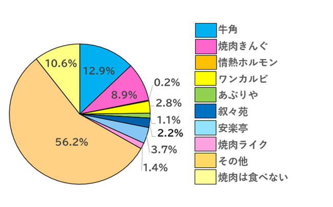 一番多かったのが「牛角」、次に多かったのが「焼肉きんぐ」という結果になりました。「牛角」は店舗数も日本で一番多く、「焼肉きんぐ」が次に店舗数が多いので、必然的に行く機会が多くなるのかもしれませんね。