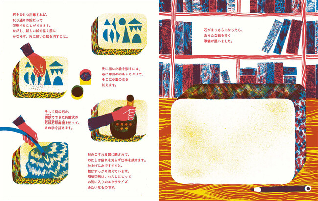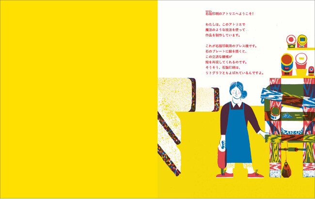 本書は2021年に、フランスのeditions MeMoから刊行されたアーティストによる絵本の翻訳版。活版印刷、石版印刷や製本など、本と印刷にまつわる、歴史や技術の素晴らしさを、幅広い世代の人々と分かち合いたい、というギャビー・バザンの願いから生まれました。