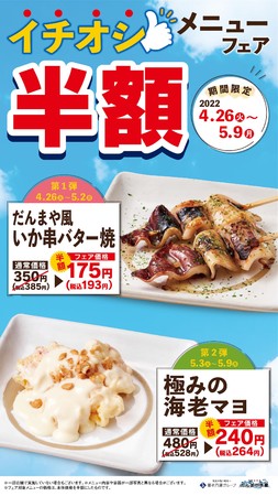 本フェアでは、新たに加わるメニューとリニューアルしたメニューについて、期間中、通常価格の半額でフェア対象のメニューを提供いたします。2022年4月26日(火)~5月2日(月)の第一弾では、養老乃瀧において、白くサッパリしたマヨネーズソースで仕上げた「極みの海老マヨ」を、だんまや水産においては、お客様の目の前でバターソースをかけて仕上げる「だんまや風いか串バター焼」を販売。2022年5月3日(火)~5月9日(月)の第二弾では、養老乃瀧において、更にジューシーで肉の旨味を感じる様になった「メンチカツ」、だんまや水産においては、「極みの海老マヨ」を販売いたします。