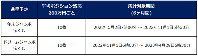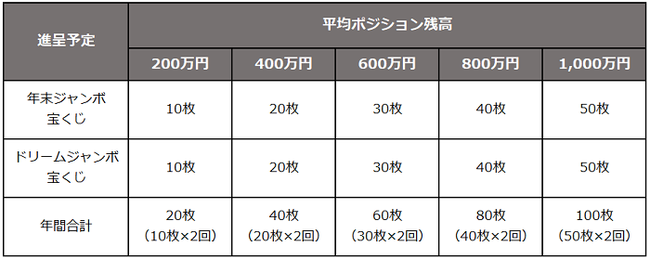 平均外貨ポジション残高 200万円ごとに、「宝くじ10枚(連番)」をプレゼントいたします。