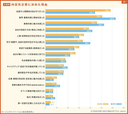 - 内定先企業に決めた理由、文系は「社風や人間関係」、理系は「業界・事業内容への興味」がトップ(図1)