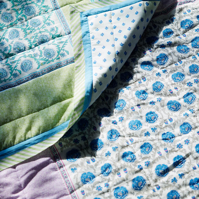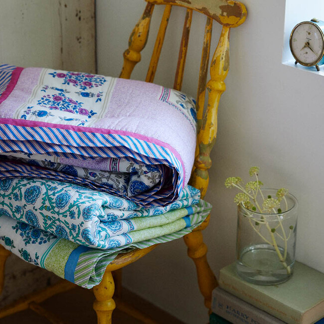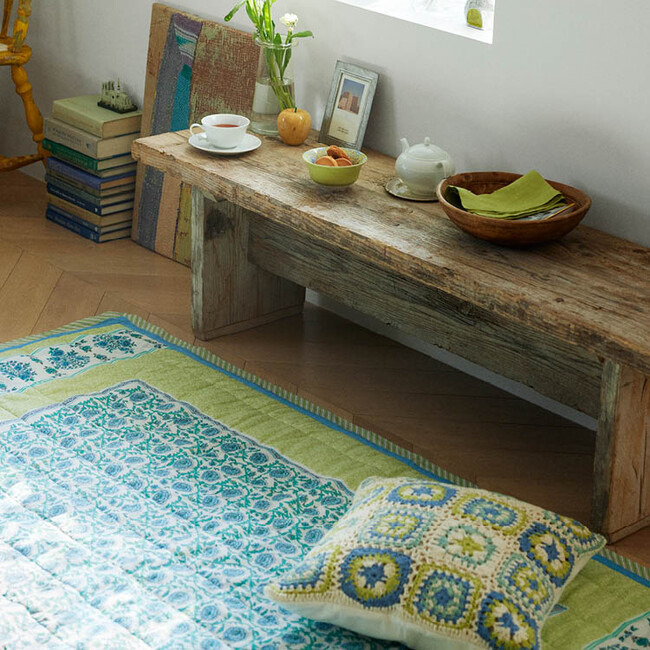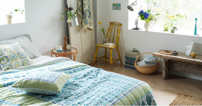 ボヘミアンテイストの花柄のマルチカバーや、手編みで作られたクロシェを贅沢に使用したクッションケースなどを展開。
