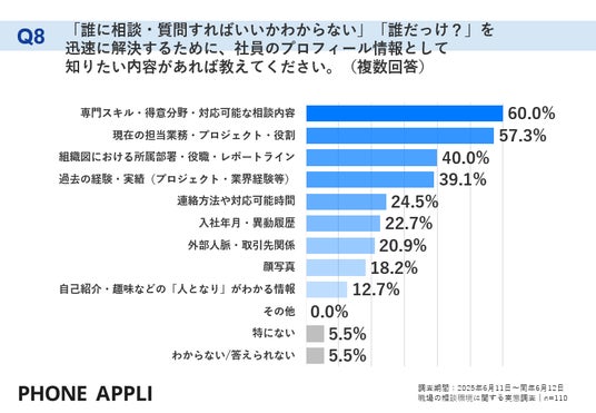 「迅速に解決するために社員のプロフィール情報として知りたい内容」を尋ねたところ、「専門スキル・得意分野・対応可能な相談内容」が60.0%で最も多く、次いで「現在の担当業務・プロジェクト・役割」が57.3%となりました。個人の専門性に関する情報へのニーズが非常に高いことが示されました。