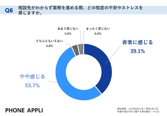 「相談先がわからず業務を進める際、どの程度の不安やストレスを感じますか」という設問に対し、「非常に感じる」が39.1%、「やや感じる」が53.7%となり、合計92.8%が不安やストレスを実感していることがわかりました。