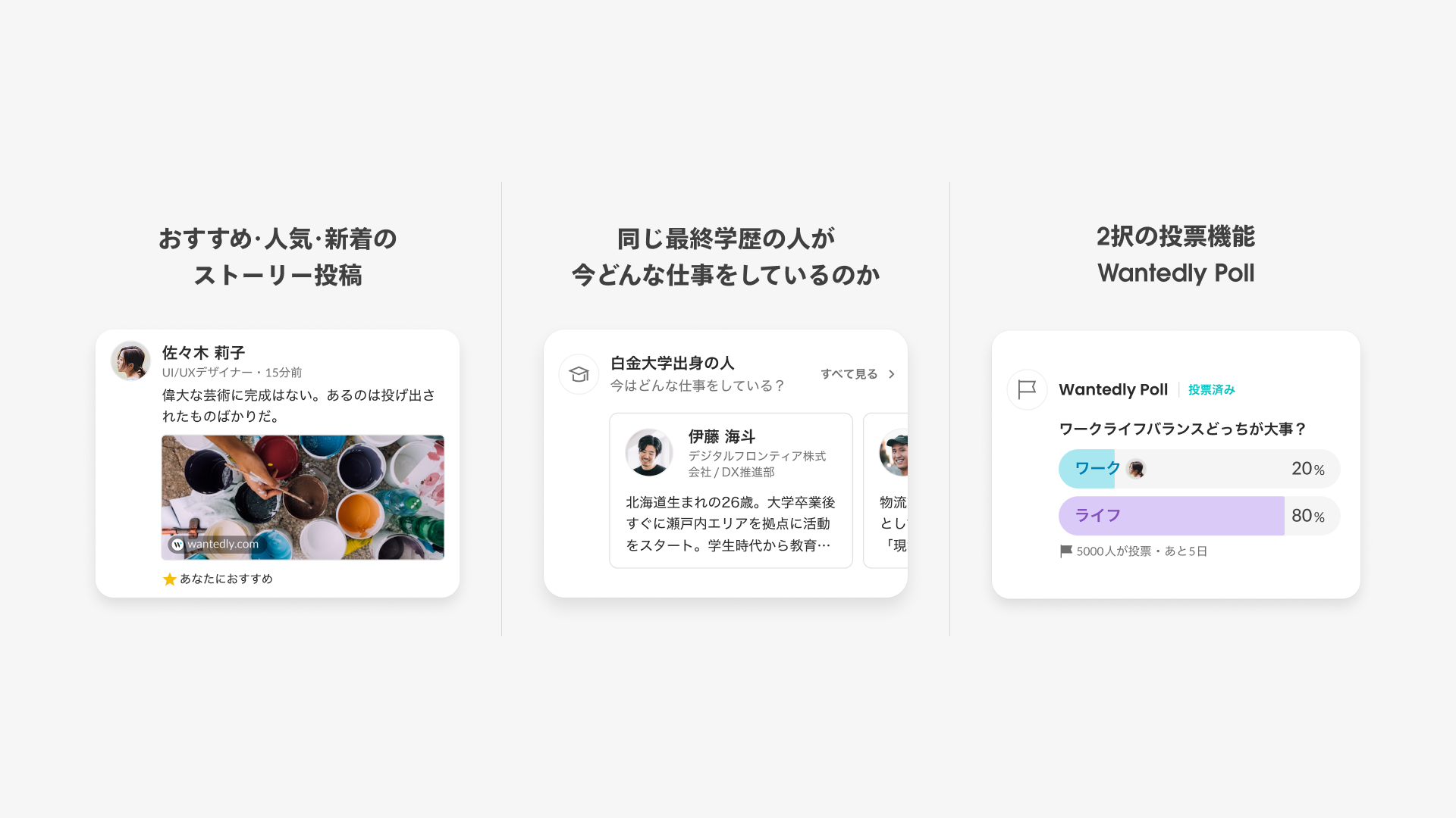 今回リリースする機能の1つ目は「ストーリーのパーソナライズ表示」です。Wantedly内で閲覧できるブログ記事「ストーリー」を、ユーザーの興味に最適化したものを届け、日常業務をスムーズにするためのコツや、キャリアアップに向けたヒントを見つけやすくします。個々人にマッチするテーマの他にも、Wantedly上で新しく公開された記事や、閲覧数が伸びている人気のストーリーも表示することで、視野を広げ、新たなキャリアの発見につなげます。