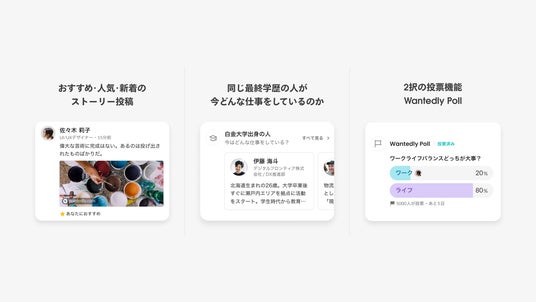 これまでWantedlyは、仕事探しのための利用が中心でしたが、今回の新機能の提供を機に、キャリアを日常的に考えるためのサービスとしてのイメージ形成や利用にもつなげたい考えです。