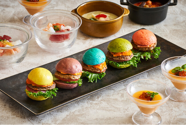 当ホテルオリジナルのバンズやパテ、ソースを使用する人気のハプナバーガーを5周年にちなみカラフルな5色のラインナップでご用意。いちごを使用し色付けしたピンク・ほうれん草の緑などの色鮮やかなバンズに、食べ応えのあるパテ、甘みを感じるソースなど、味にも見た目にもこだわったハプナバーガーをお楽しみいただけます。