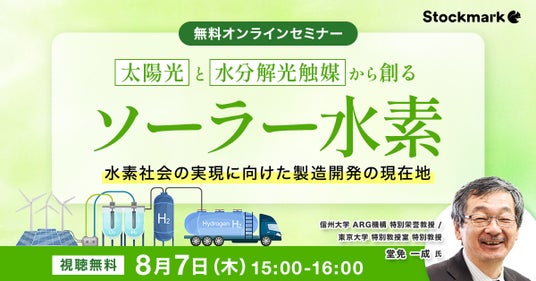 製造業向けAIエージェント『Aconnect』を提供するストックマーク株式会社(以下、「当社」)はオンラインセミナー『太陽光と水分解光触媒から創るソーラー水素 水素社会の実現に向けた製造開発の現在地』を8月7日(木) に開催致します。