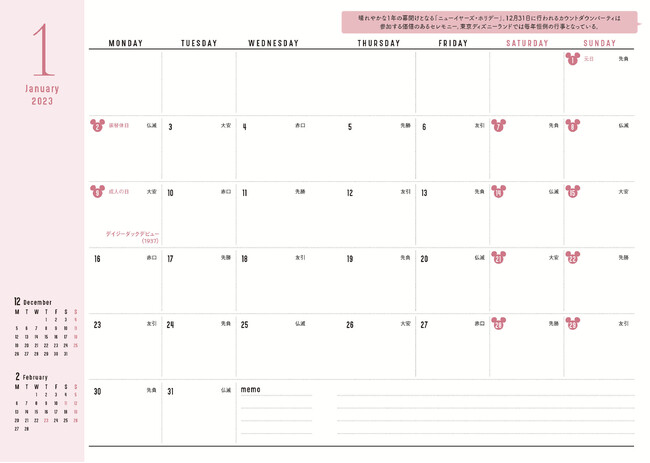 ・2022年12月~2024年1月のマンスリー&ウィークリーの2種類のダイアリーを掲載